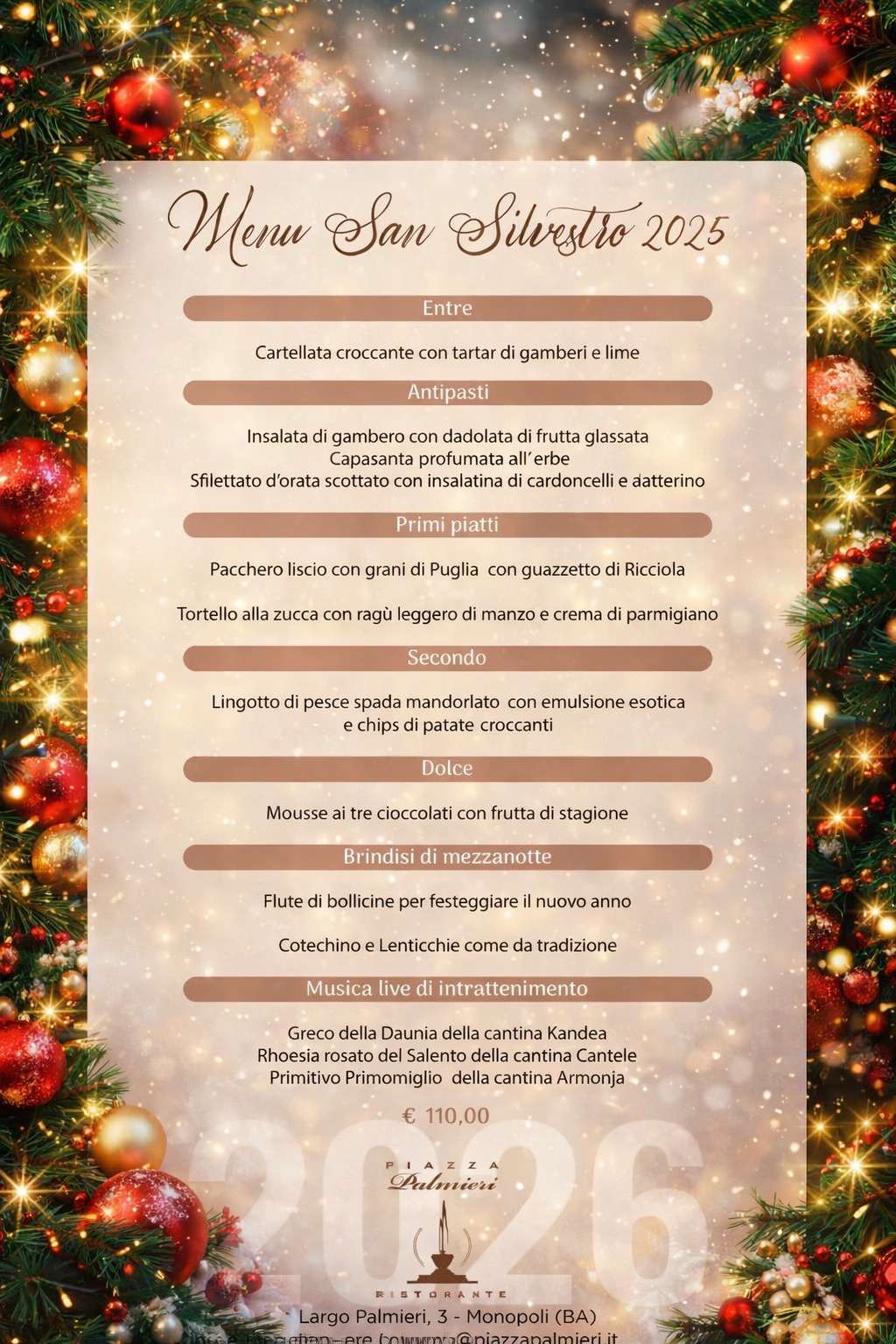 fa da musa ispiratrice per la realizzazione di meravigliosi ricercati e singolari piatti, resi unici dal pesce freschissimo dell’Adriatico. Ristorante Piazza Palmieri vi presenta i migliori menù pensati e preparati dal nostro Chef.